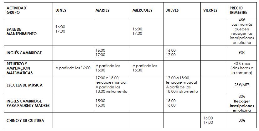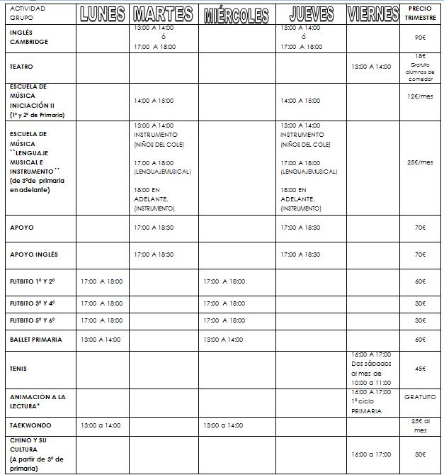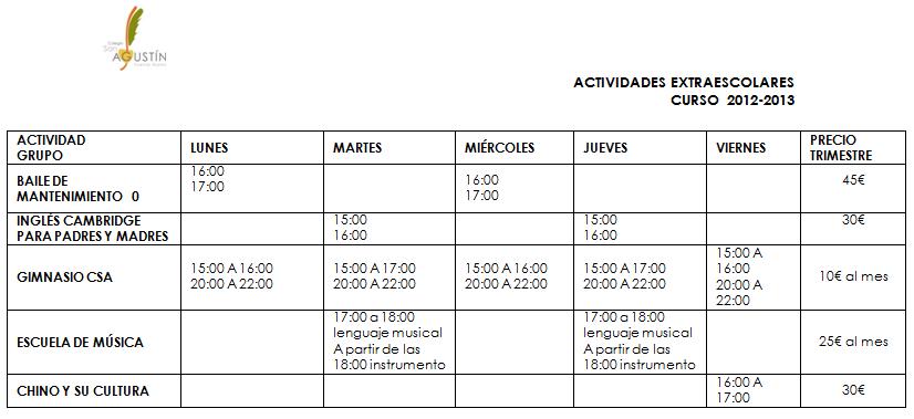 - Las actividades extraescolares comenzarán el 1 de octubre de 2012 y terminarán el 31 de mayo de 2013.( excepto ballet,apoyo, taekwondo y escuela de música que continúan en junio).