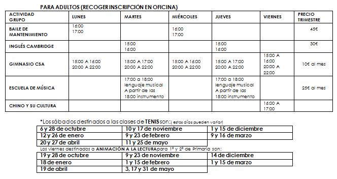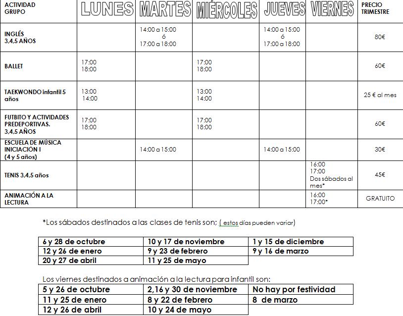 - Las actividades se ofrecen con el horario que aparece en la tabla y no se pueden realizar cambios individualizados.